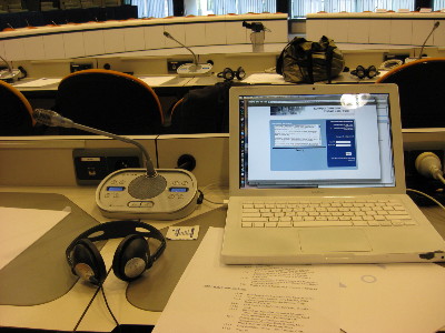 Work today, at the workshop I was signed up to attend. Didn't say much during the workshop, and Nigel (who was speaking) had to prod words out of me in public at the end. I am shy and retiring when I'm in an unfamiliar environment (no, really!); and the Translatatron 2000 room I was in at the Charlemagne Building, European Parliament, was plenty unfamiliar: