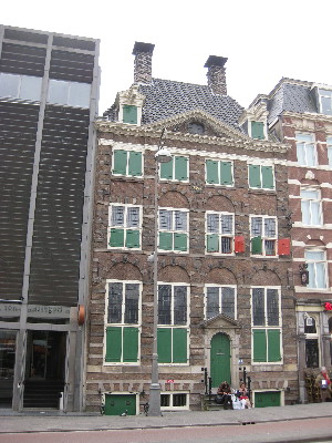 The disaster in the middle is Rembrandt House Museum. The pretty and Hollandically sensible house to its right is Rembrandt's actual house. And the place to the right of that is where you too can buy a Rembrandtburger downstairs for €8.50...