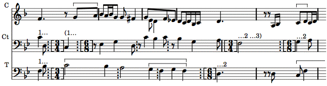The countertenor, like the tenor, does half a bar of 6/8—"1…", then switches to 3/4. After just one beat of 3/4—"(1…", it gets bored of that, and switches back to 6/8 for three bars. What undermines the double switch to our ears is, his three bars of 6/8 𝄾 𝅘𝅥 𝅘𝅥 𝅘𝅥𝅮 sound like syncopated 3/4 to us now; but switching metres was a way of doing syncopation back then anyway. After that, the countertenor has to sync back up with the other two voices. That means first finishing off the other two beats of his 3/4 bar—"…2 …3)", and then finishing off his original 6/8 bar—"…2"—one measure after the tenor finished his.